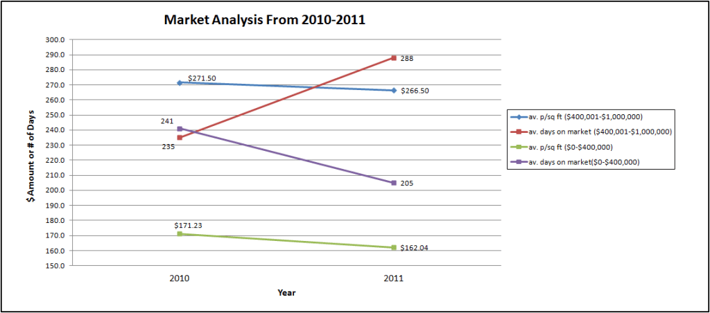 So here we go, from 12/12/2008-12/12/2009 (year of 2009) the average sales price for homes in the lower range ($0-$400,000) was $264,743, and in 2010 this number was $277,956. Which means from 2009 to 2010 in the lower price range, the average sold price increased $13,213, 4.9%. As mentioned in the other post, from 2010 to 2011, the average sold price decreased $3,043, 1.01%. For the higher price range in 2009 the average sold price was $624,067 and for 2010 this number was $641.229, showing an increase in average sold price of $17,162, 2.75%. The average sold price in 2011 was $633,812, a decrease from 2010 of $7,417, 1.17%. This means prices in 2011 are down from prices in 2010. Don’t forget there are many other variables to consider when analyzing the price changes of sales of Residential Single Family Homes, this analysis is as broad as you can get, but it gives you a small idea of the changes happening in our markets.